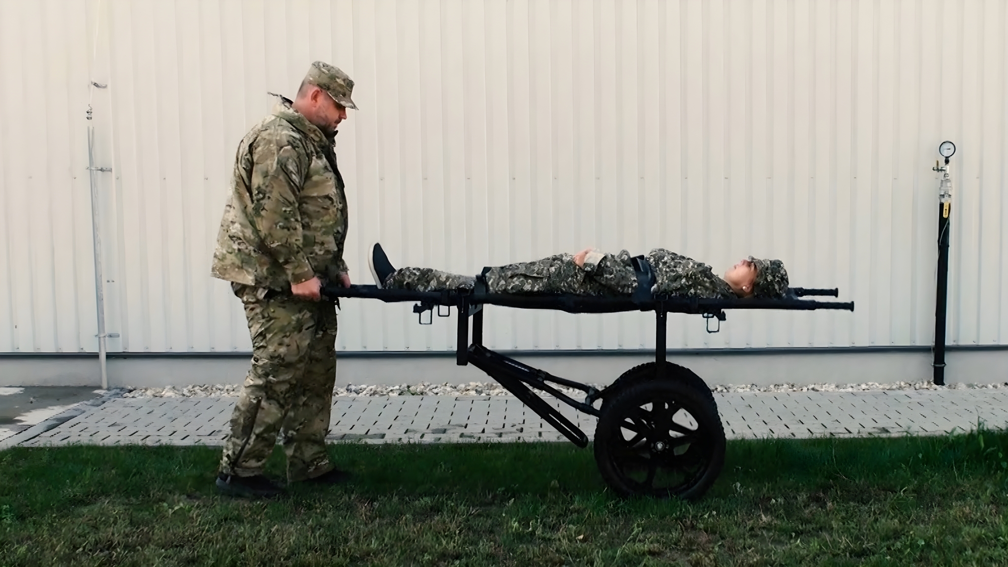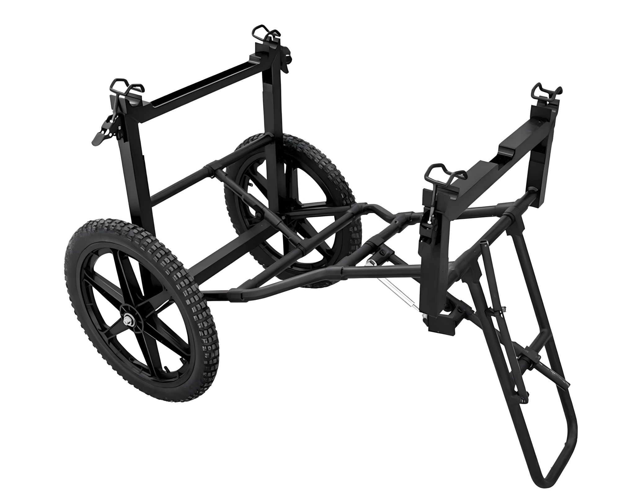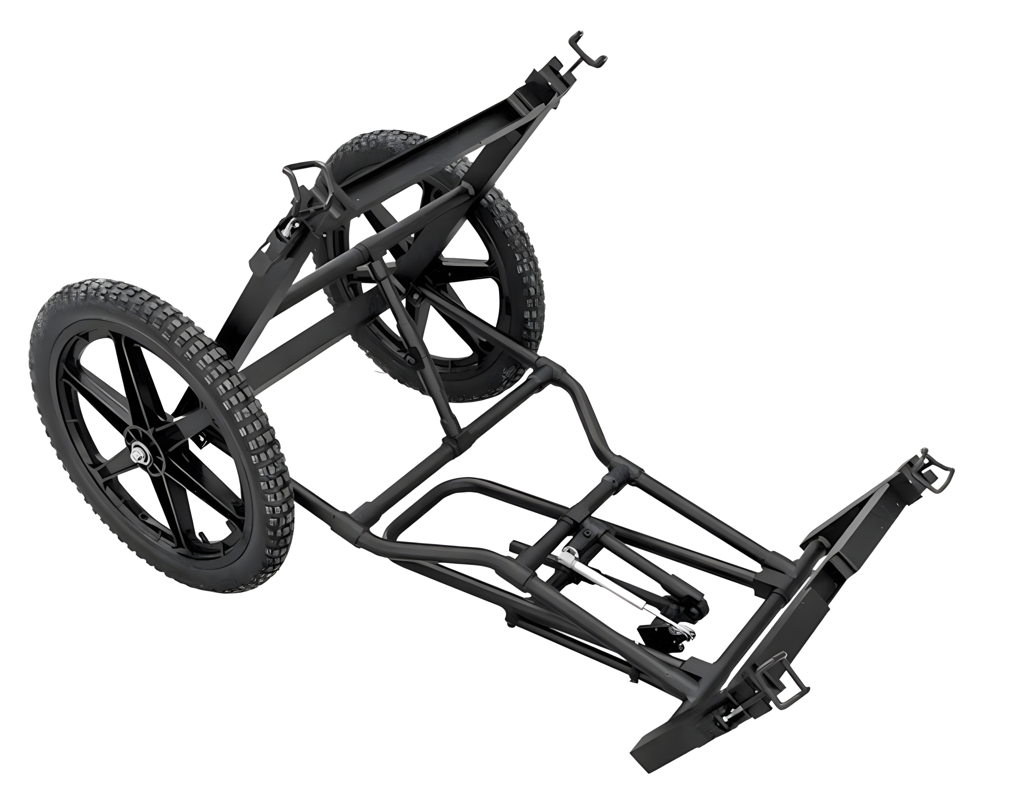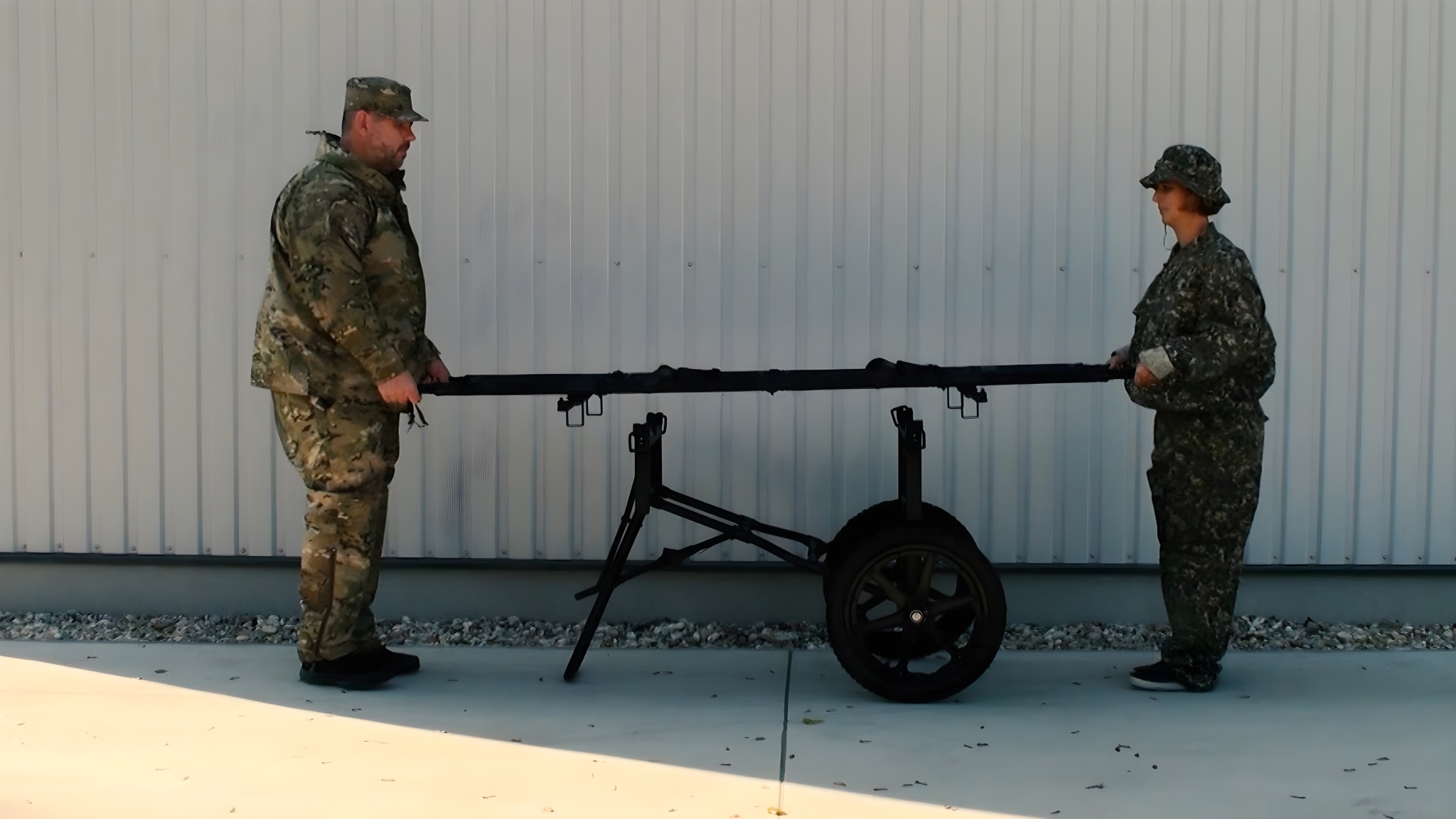 Hjulvagnen har en slitstark och hopfällbar aluminiumram som kombinerar hög hållfasthet med låg vikt. Detta gör den enkel att transportera, snabbt sätta i bruk och förvara. Den kan snabbt fästas på kompatibla bårar, vilket gör att en eller två operatörer effektivt kan transportera skadade under fältförhållanden. De stora terränghjulen ger hög stabilitet och god manövrerbarhet på ojämna underlag som sand, snö, grus och grov terräng.