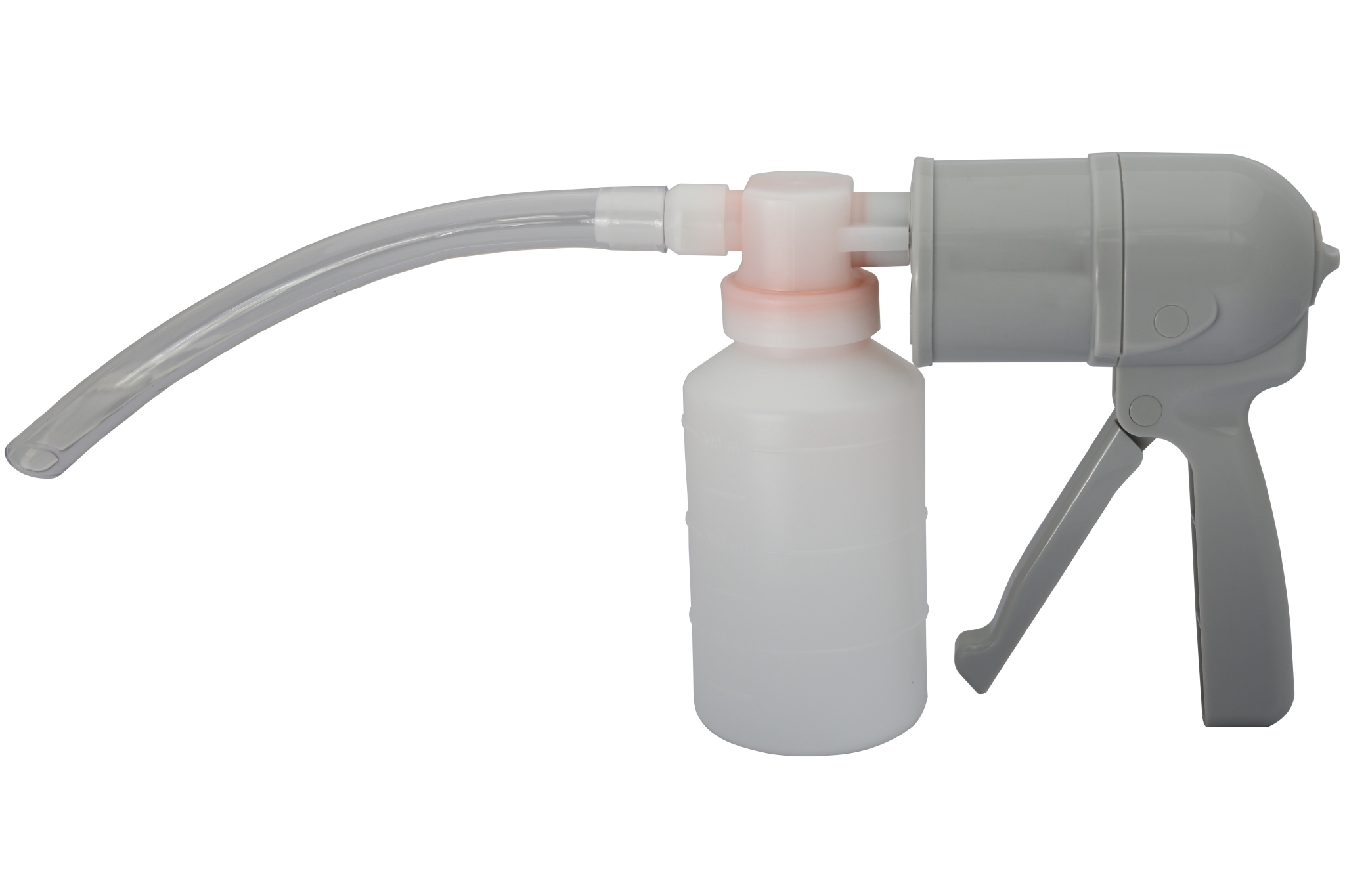 - Manuell handsug bestående av en flergångsdel och utbytbara engångsbehållare.